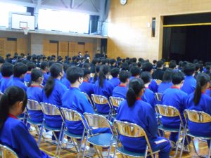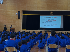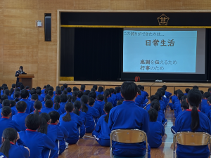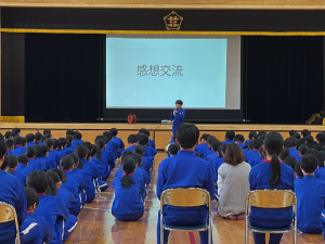 1・2年生も背筋を伸ばして真剣に話を聞いていました。発表を聞いて、「自分たちも頑張ろう」、「こんな学級を目指したい」という思いも生まれたことでしょう。