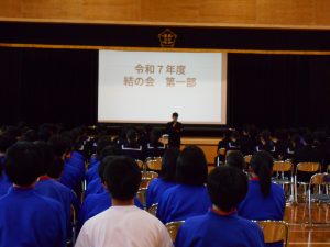 この会では、各委員会から一年間の活動の成果と課題が発表され、さらに3年生の各学級が、「学級の財産」について紹介しました。